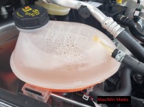 Identify high/low level markings on header tank where fitted or radiator filler cap, and describe how to top up to correct level. This is done by filling the tank with a solution of antifreeze and water up to the max mark. The tank is on the front left. The larger one.