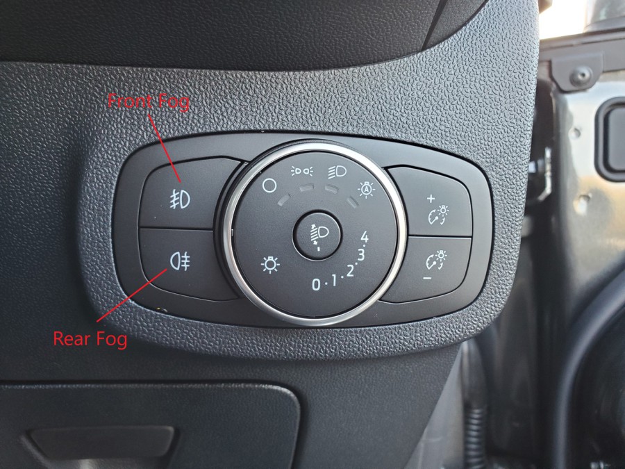 Operate switch (turn on dipped headlights and ignition) press the buttons for the rear and front. Check warning light is on and explain that when visability is less than 100m you need to switch fog lights on.