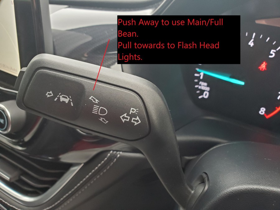 Turn on dipped head lights to manual position and operate stalk by pushing stalk away from steering wheel (with ignition or engine on), check main beam warning light (blue) is on in front of you on instrument cluster. Turn off by pulling towards steering wheel and return head lights switch to auto and switch ignition/engine off.
